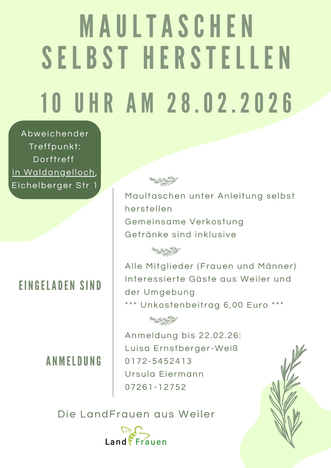 Die LAndfrauen Weiler bieten im Dorftreff Waldangelloch an, Maultaschen selbst zu machen und zu verkosten. Bitte anmelden bis zum 22.02. Unkostenbeitrag 6,00 EUR