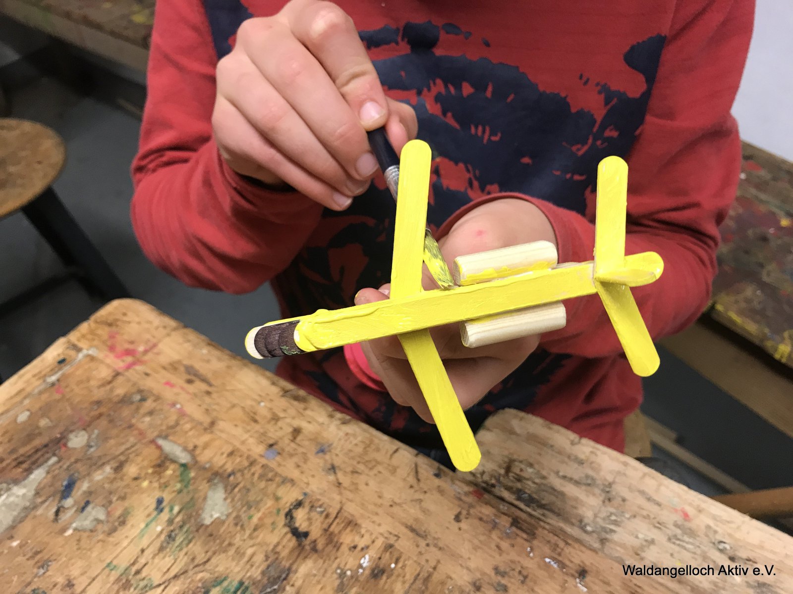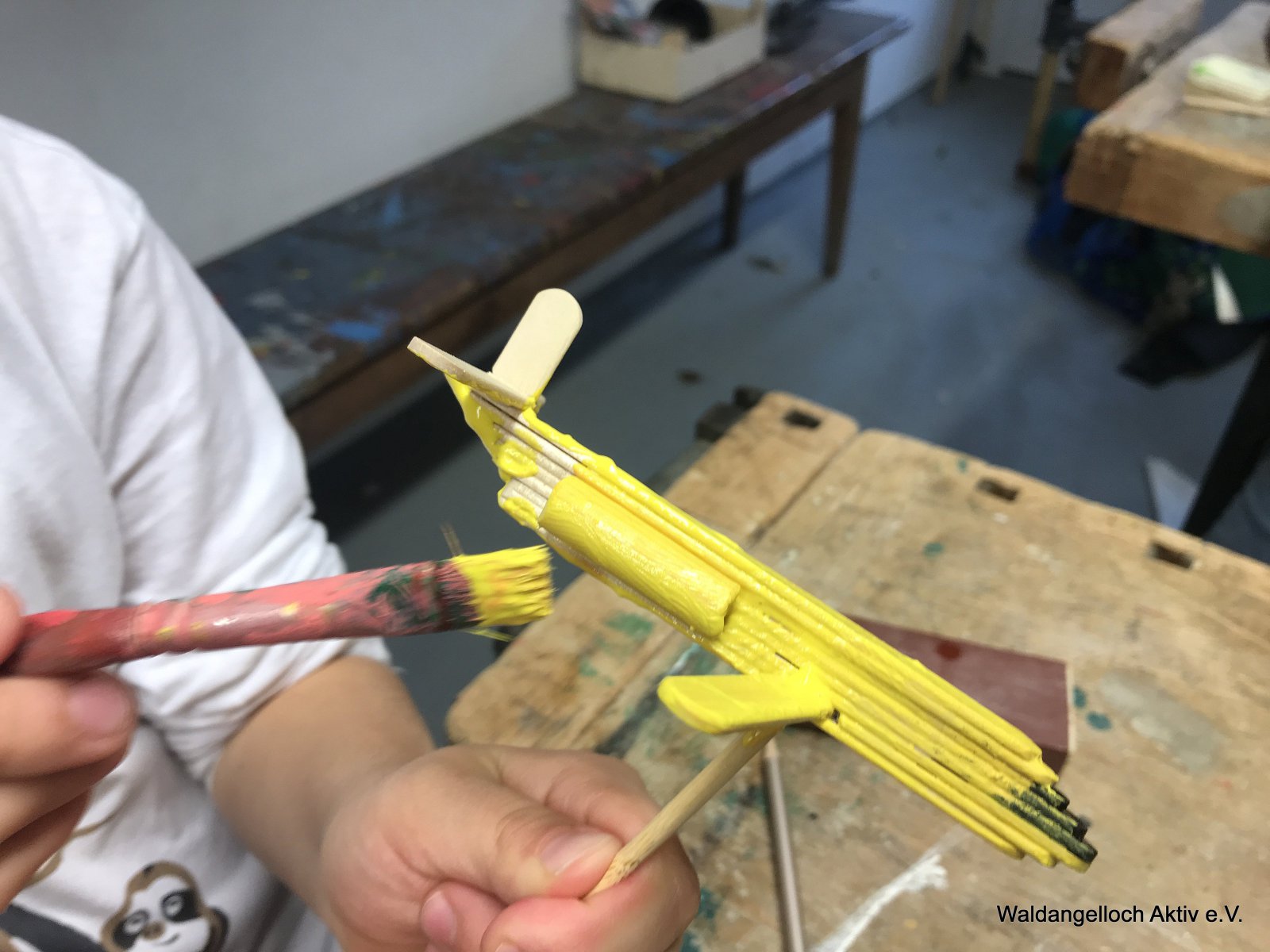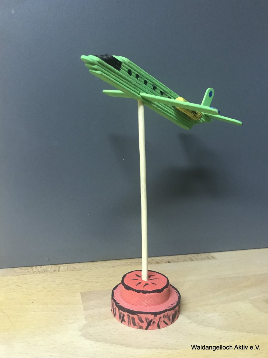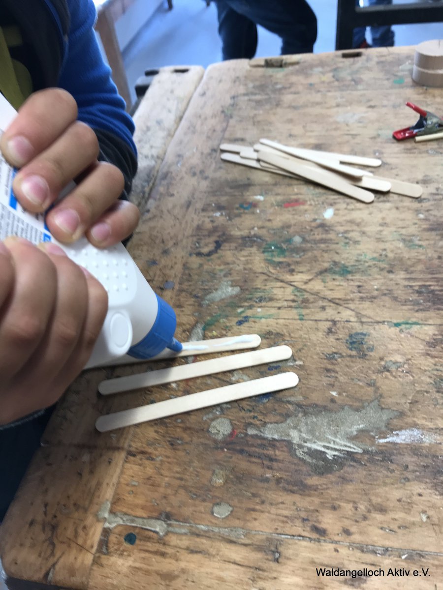 gebaut aus Eisstielen, 2 Dübeln, 1x Spiess, 2x Holzscheiben und viel Holzleim. Dieses Projekt wurde von den Kindern in 2 x 1,5 Stunden vollendet