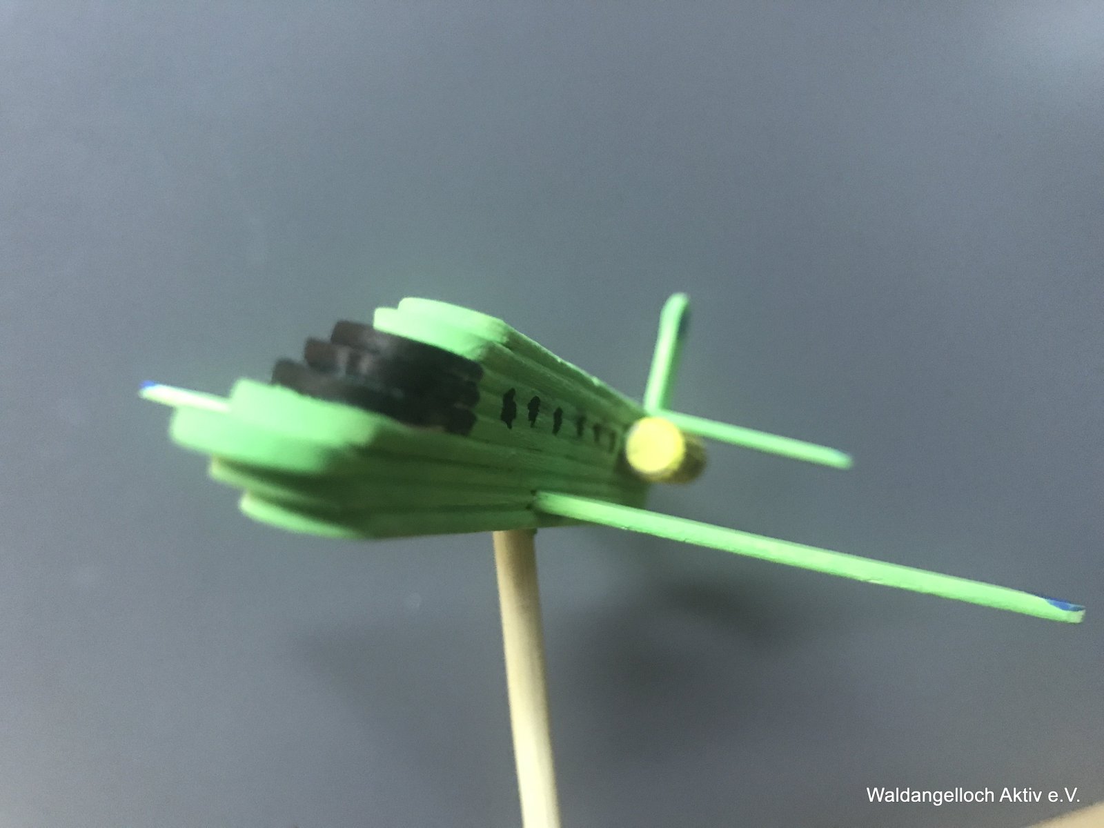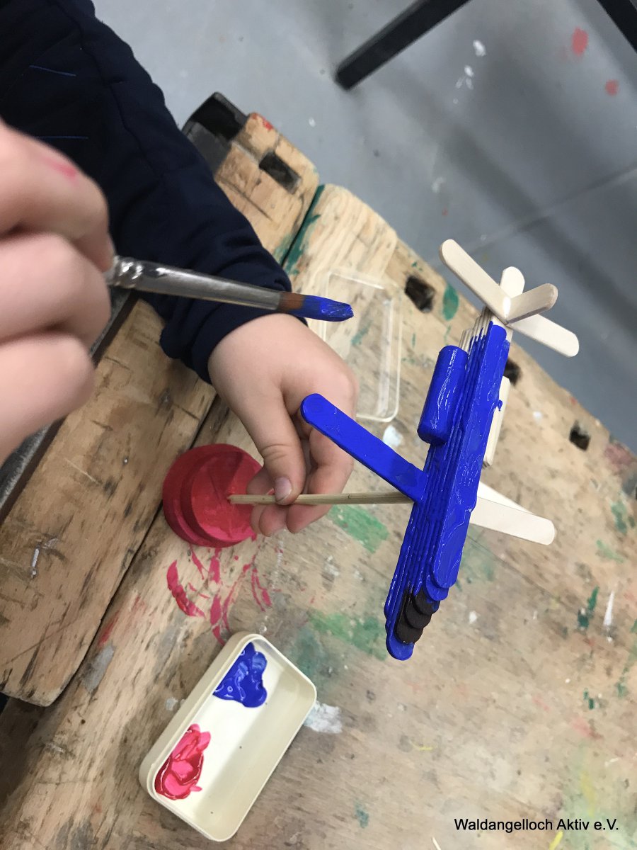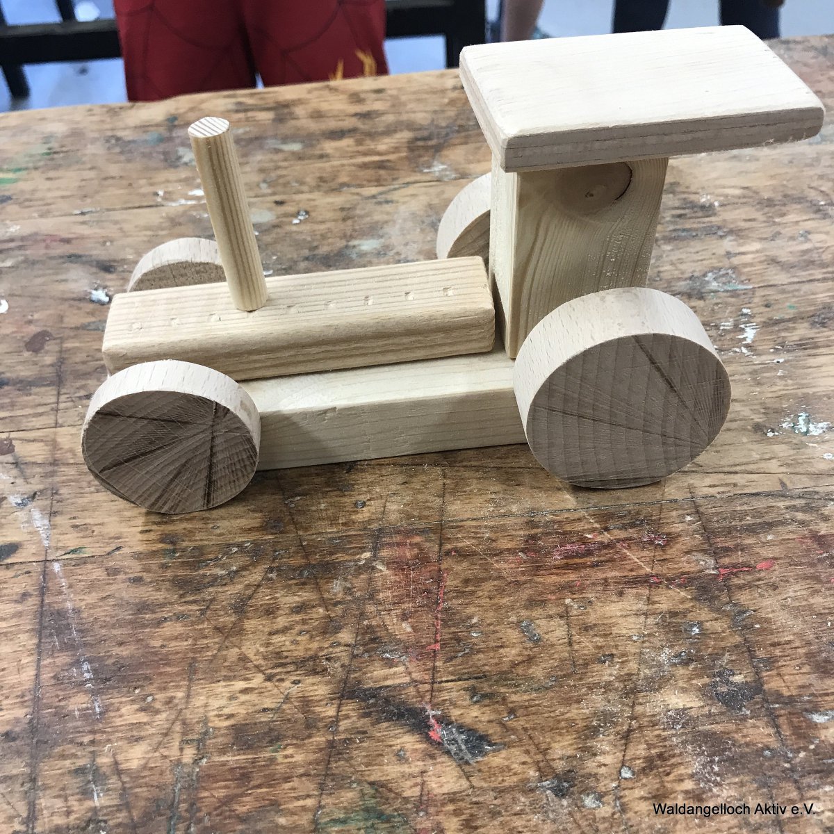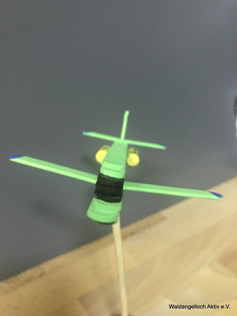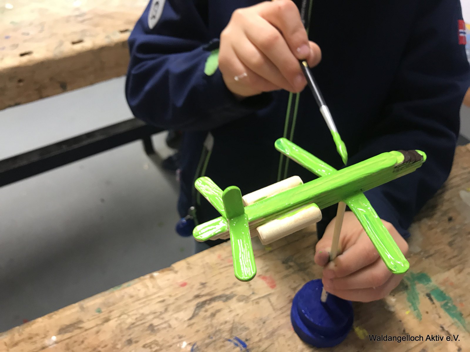 gebaut aus Eisstielen, 2 Dübeln, 1x Spiess, 2x Holzscheiben und viel Holzleim. Dieses Projekt wurde von den Kindern in 2 x 1,5 Stunden vollendet