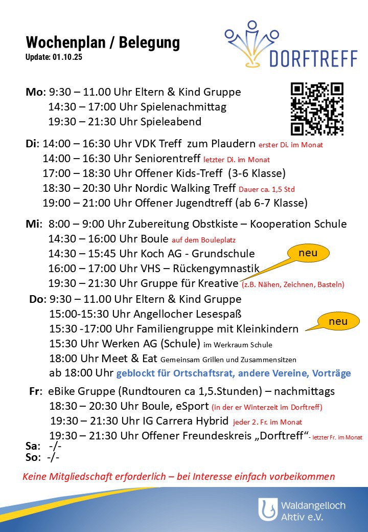 26. Oktober 2025Das Leben im Dorftreff ist vielfältig und bunt. Viele ehrenamtliche Coaches und Betreuer der einzelnen sorgen Woche für Woche dafür, das etwas stattfindet und sich der Dorftreff mit Leben füllt. Macht einfach mit, schau vorbei, bringe dich ein - wir freuen uns über jeden!